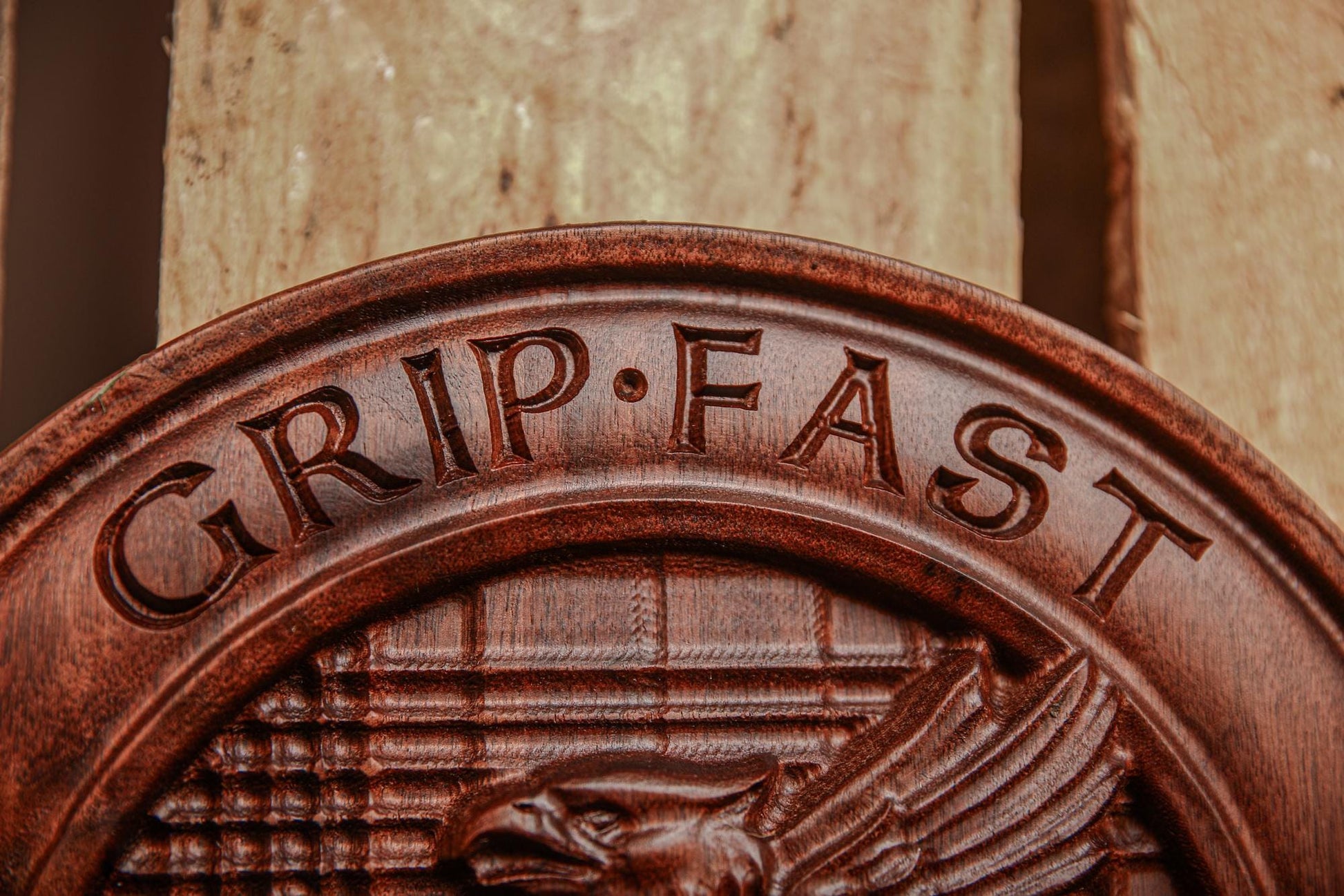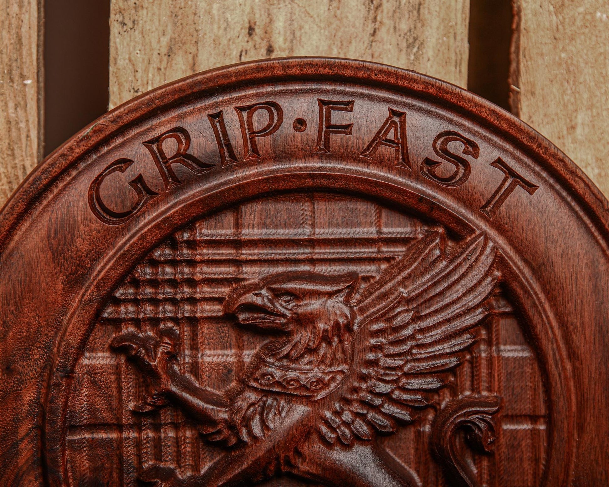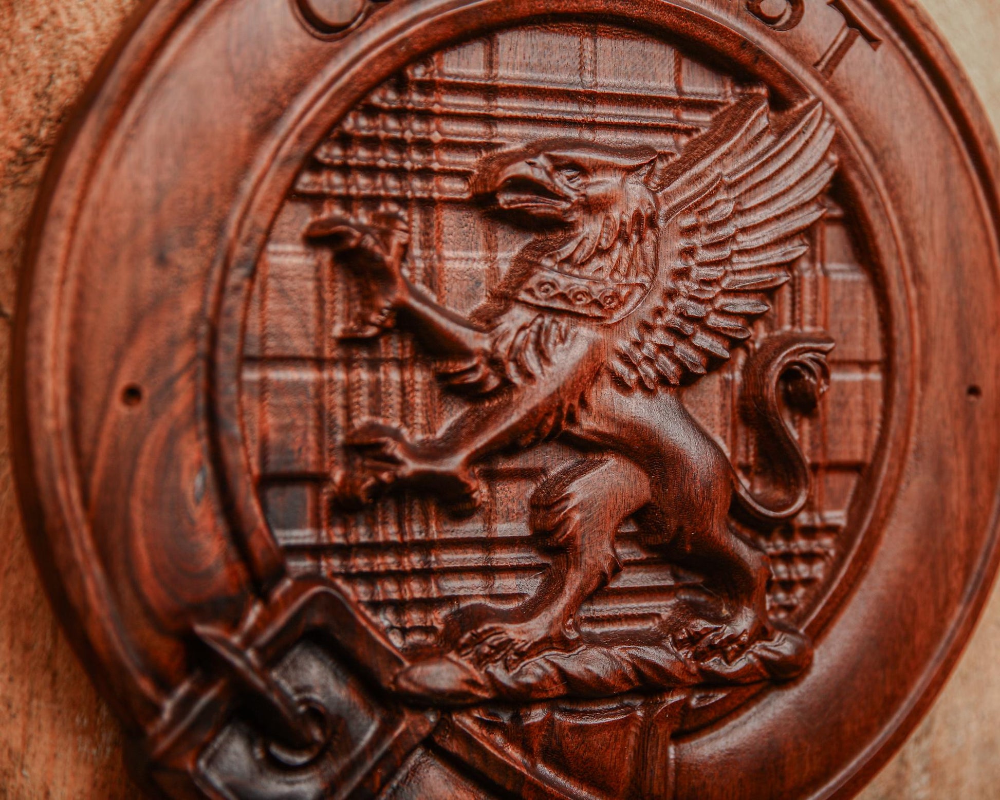 Custom Carved Scottish Clan Badge Crest in White Oak, Cherry or Walnut | 3D Tartan, Bark, Cobblestone or Smooth Background