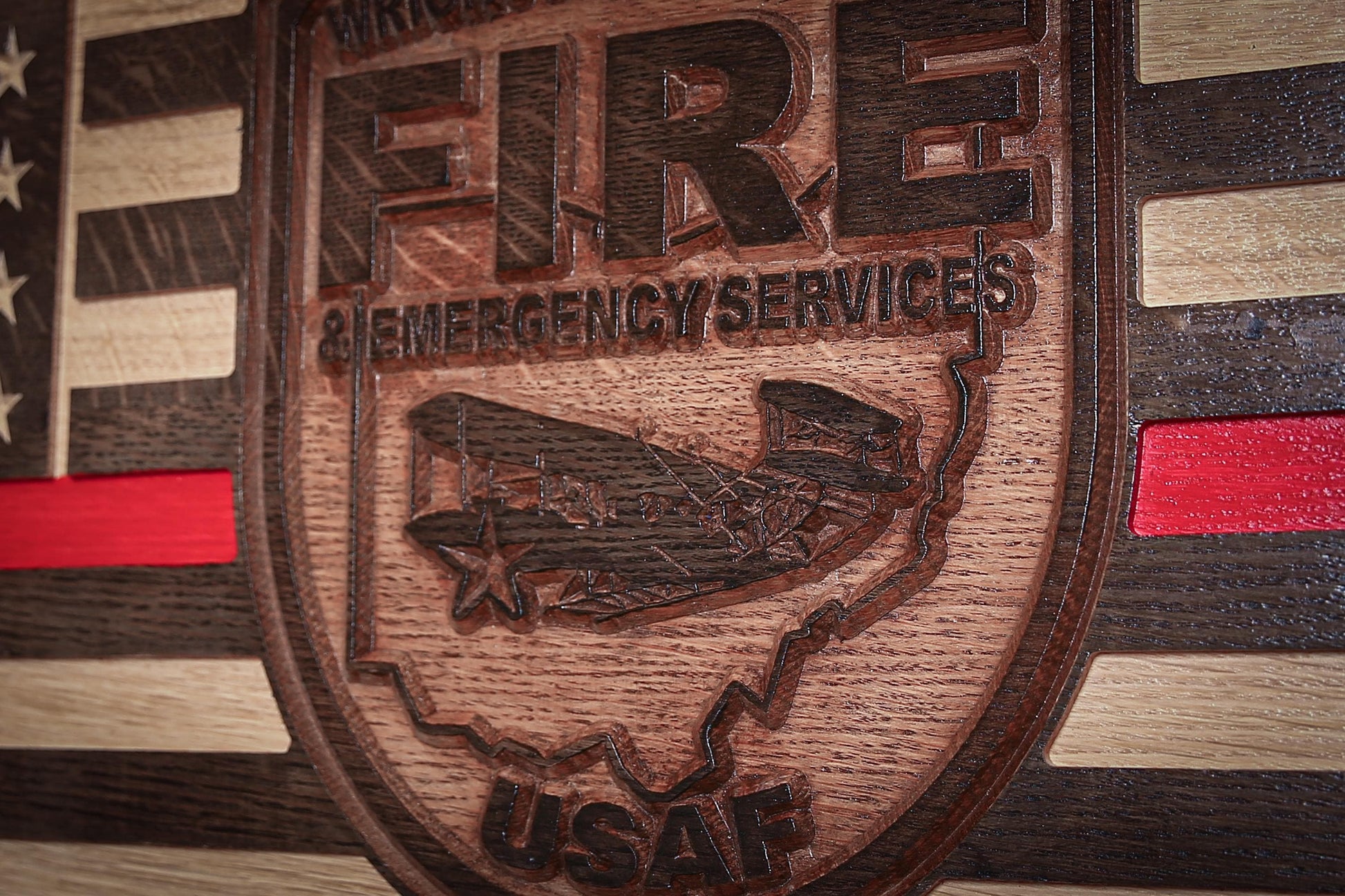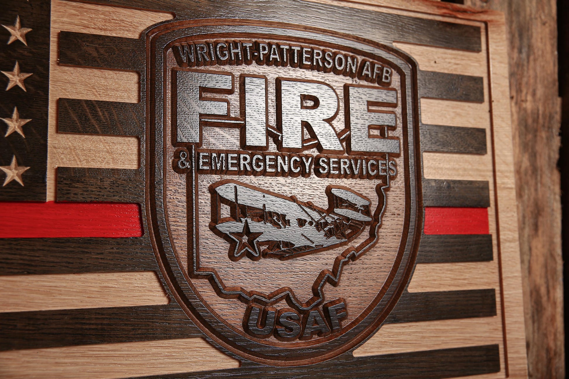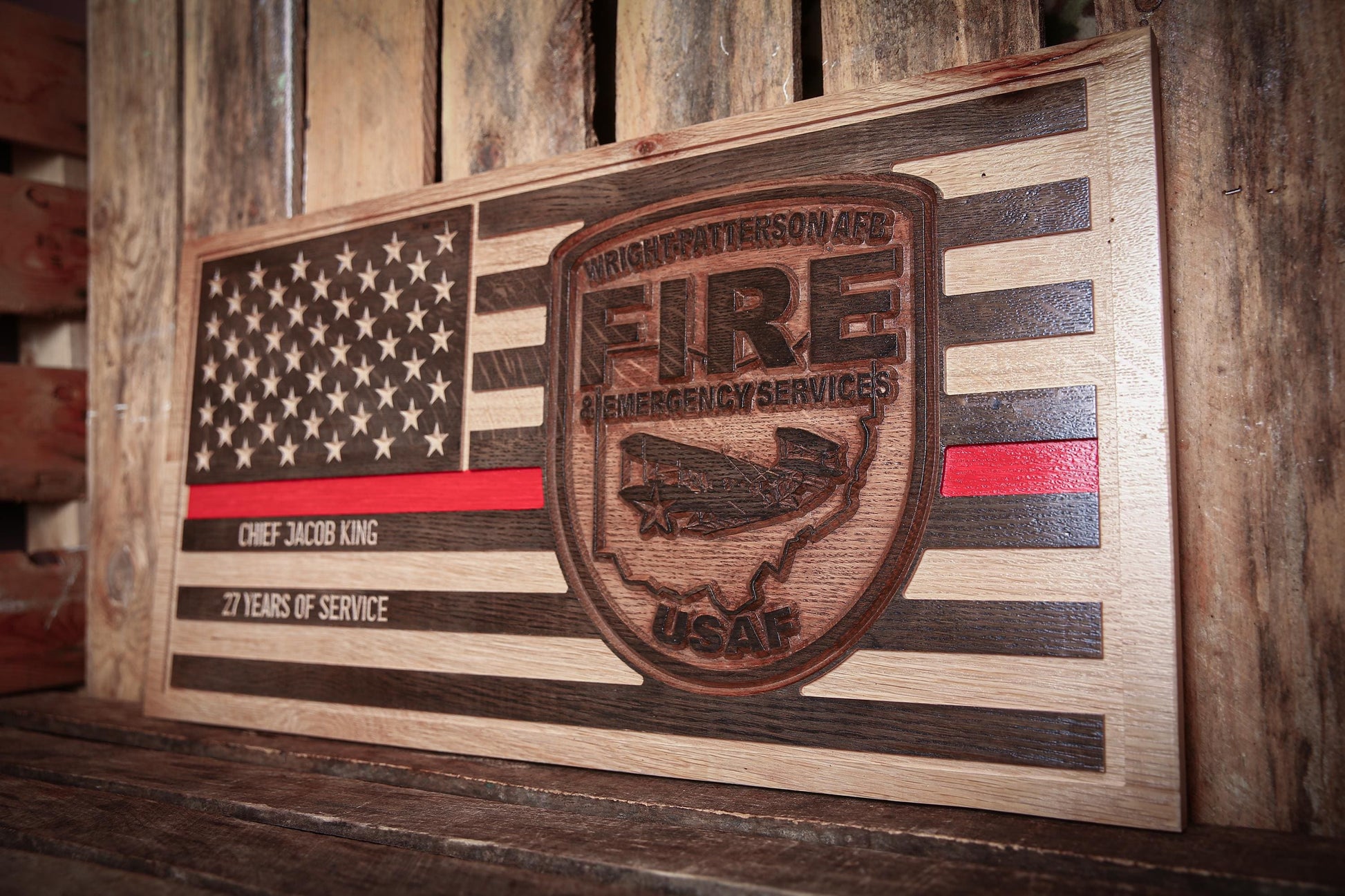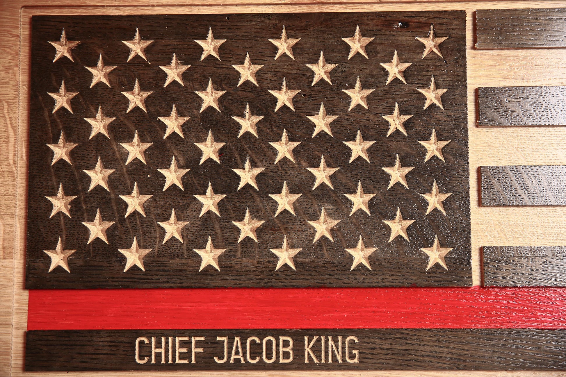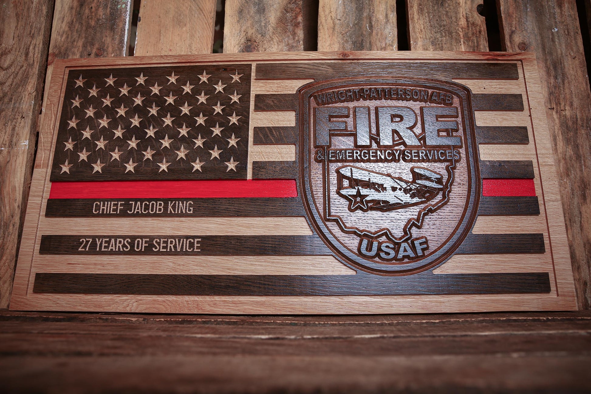 Are you looking for a unique custom firefighter retirement gift? Look no further than this personalized Thin Red Line flag. This firefighter themed American Flag is made using the emblem representing the fire department of your choice. This custom designed flag can be ordered the "thin red line" themed black and red. This particular design uses will require a quality graphic of the emblem that you would like carved into the flag which can be acquired from the department itself or often right off the internet. Your flag can be personalized with the text of your choice carved into the stripes to commemorate your loved one's public service. This wooden flag is a perfect gift for the new firefighter, retiree or any special occasion when a unique gift is needed. Each flag is finished in 3 coats of polyacrylic. For wall mounting, we will route a channel in rear of the flag. We currently offer this flag in 3 different sizes: 16"x8" 24"x12" and 32"x16". Please be sure to select desired size at checkout.