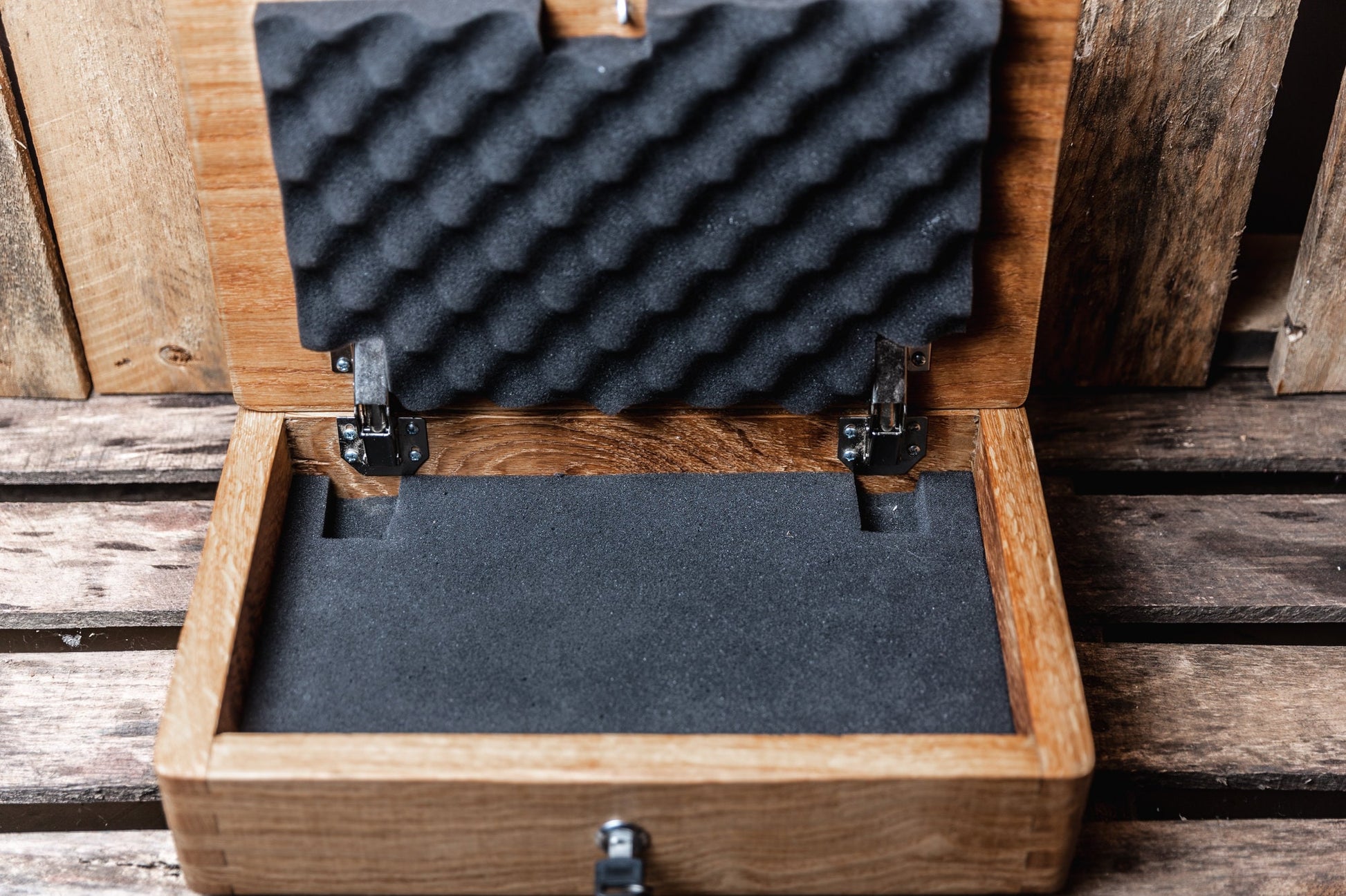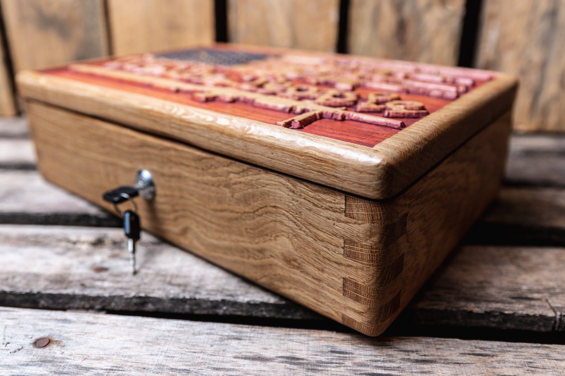 You are viewing a gorgeous solid rustic white oak gun concealment case! The lid of this amazing pistol display case features a carved American flag with "We the People" engraved in it and stripes represented by different types of firearms. This case is made of beautiful .75" thick rustic white oak. Our boxes feature finger jointed corners and measure 15.5"x10"x4" outside and 14"x8.5"x2.75" inside. We hand sand our cases then finish the flag in red/blue stain. The box is then sealed with a combination of poly and beeswax. High quality hidden hinges are not visible from outside the case. We offer an optional lock comes with 2 key's. Also optional with our cases is a piece of un-cut 1.5" thick foam that can be cut to accommodate the shape of your firearms, ammo etc. as well as a piece of egg crate foam that is attached to the top of the lid. This is a very high quality box and is built to last a lifetime ! This is defiantly the highest quality box of its kind on Etsy. Please note that we only use 100% quality solid hardwood on our concealment cases. We do NOT use cheap soft woods like pine or 2x4's in any of our cases. Wood grains will vary from box to box and no 2 boxes are 100% alike . I try to keep at least one box ready at all times so that I can ship the same day orders are placed. If I do not have one ready to ship at the time of order it will be constructed and ready to ship within 3 days. I ship via UPS fully insured. As soon as item is shipped I will contact you with a tracking number. Please feel free to contact us with any questions at MrGoodWoodCNC@gmail.com