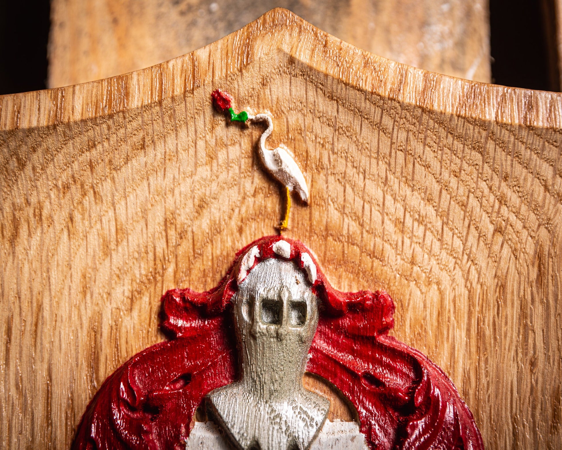 You are viewing a beautiful custom carved coat of arms plaque carved from a solid piece of white oak measuring 12"x9.5"x1". The plaque is gradually carved inwards while leaving the coat of arms standing proud with raised lettering beneath it. The helm, flourishes and shield are the same in all designs however, the contents of the shield, name, motto and the crest atop the helm are customizable. Available in painted or natural with poly finish. All plaques fitted with a claw tooth hanger for mounting. A 3D rendering of your order is provided prior to production to ensure accuracy. Please contact prior to ordering with questions you may have.