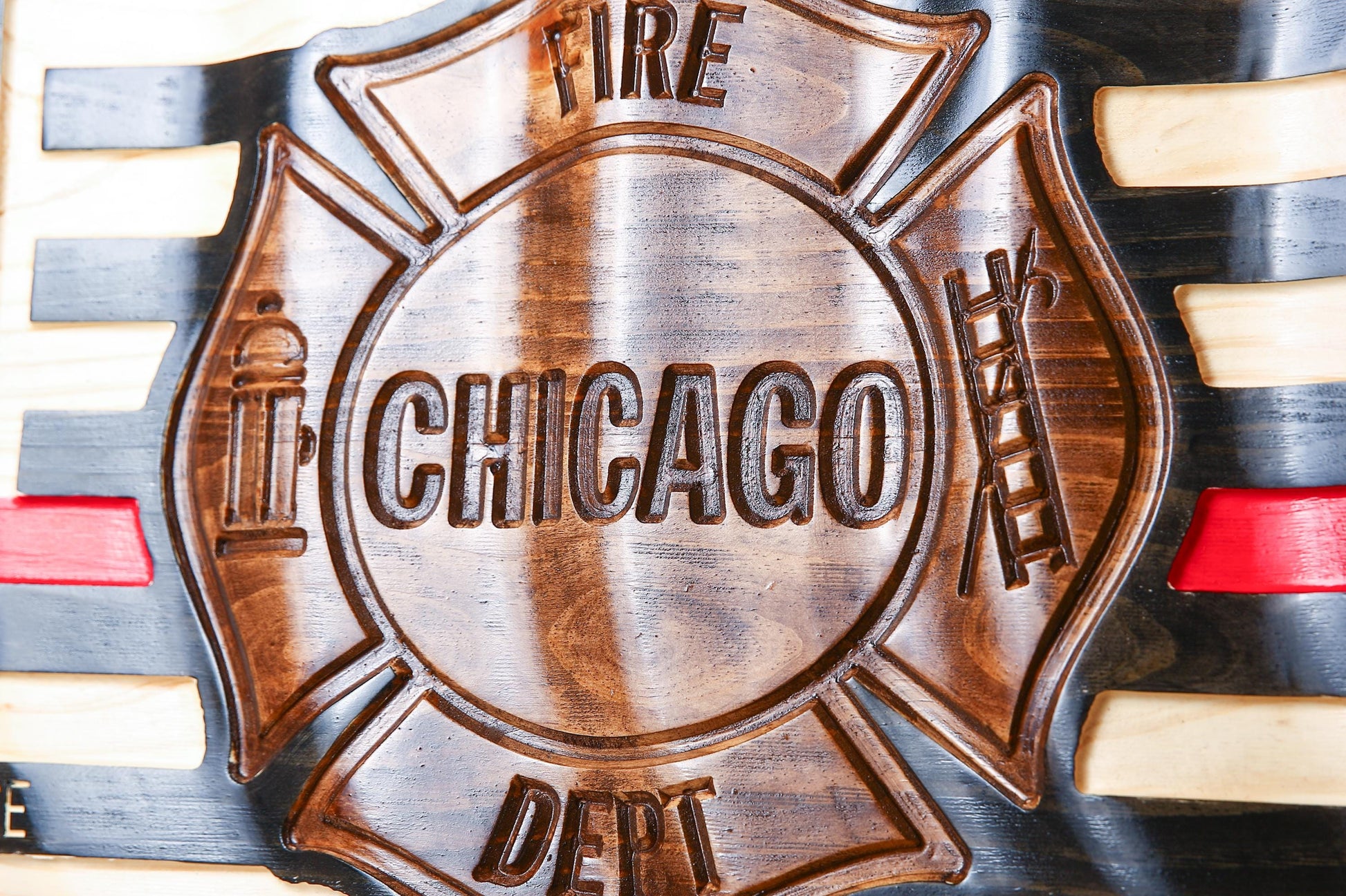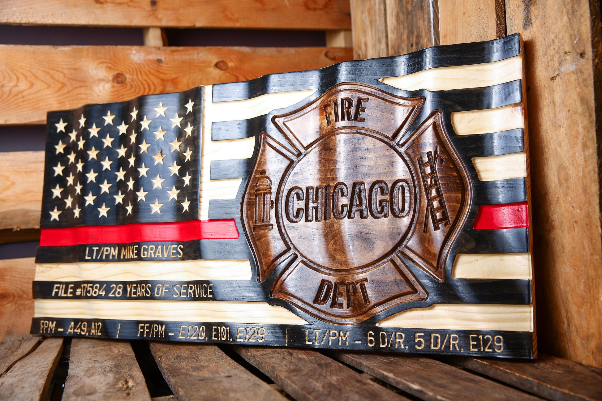 What sets this flag apart is the ability to personalize it with your custom department emblem, as well as the firefighter's name and years of service. These elements are incorporated into the stripes of the flag, making it a truly unique and personalized gift. To ensure everything is correct, we send a 3D mock-up prior to carving. Simply enter your firefighter's information in the provided text box during checkout.