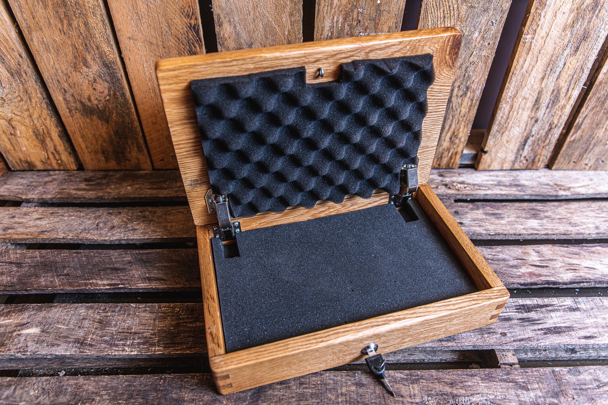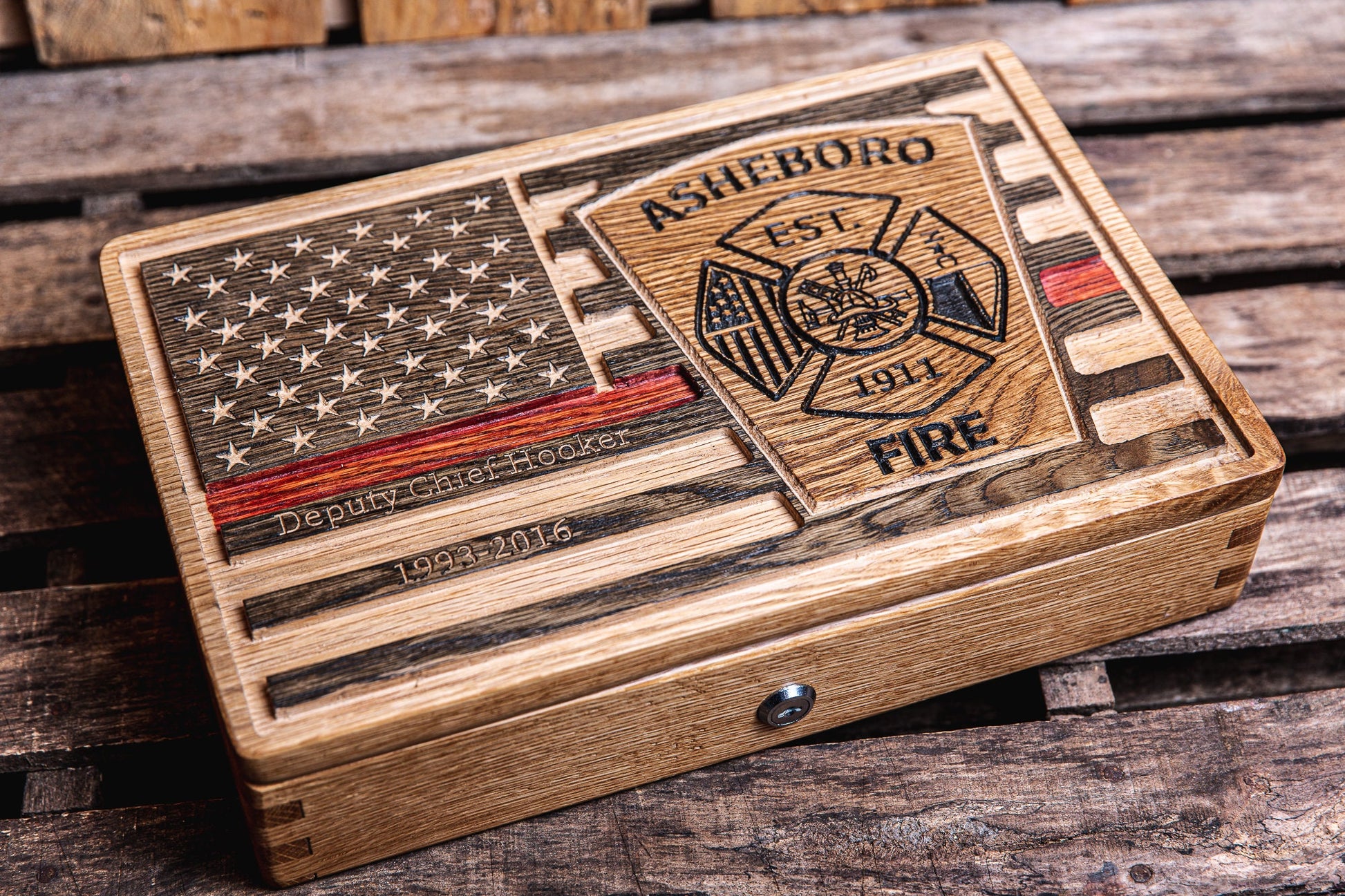 You are viewing a truly unique firefighter themed box that can be outfitted to be utilized as a keepsake box, lock box or a locking gun box with 2 foam inserts by selecting the appropriate options at checkout. This amazing box is made from 100% solid American white oak. The box lid features a carved American flag colored in the "Thin Red Line" theme and the emblem of the fire station of your choice. We can also personalize the lid with the firefighter's name, years of service etc... at NO additional charge. Please notice that the corners of our boxes utilize finger joint construction that not only adds to the aesthetics of the box but also the durability. The hinges used on the lid are spring loaded cabinet grade hinges to support the heavy oak lid when the box is open. Once finished, we seal each box with a combination polyacrylic. You will not find another box like this on the internet! It is absolutely built like a tank with the intention to be handed down for generations. We only use the highest quality solid hardwoods and never use plywood, softwood like pine, mdf, veneer or manufactured woods. Wood grains will vary and each box is truly unique. No boxes are 100% alike. If you have any questions please contact us before ordering as we are happy to assist you.