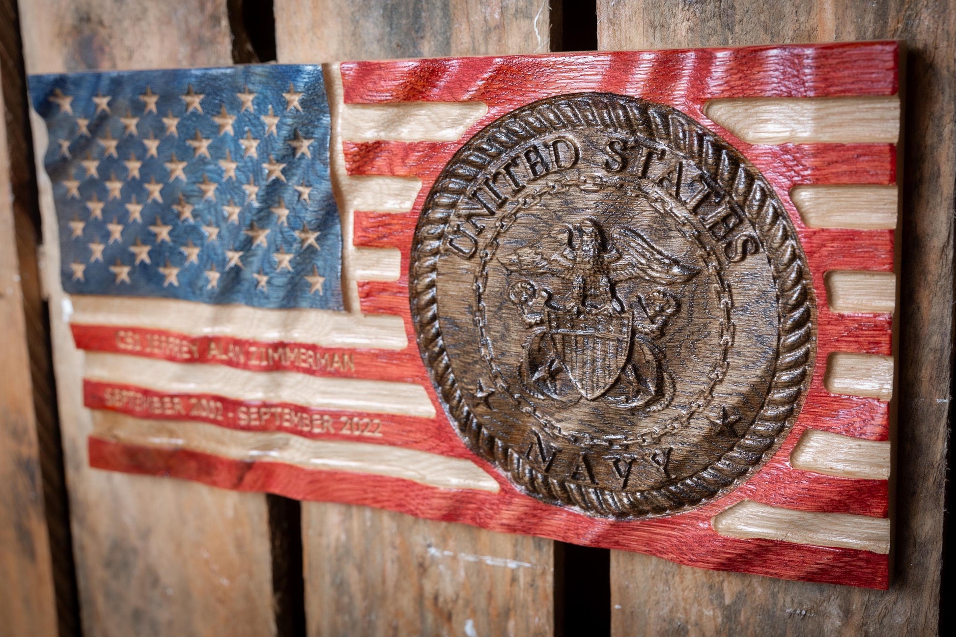 Whether it be for retirement, graduation or any other occasion this personalized United States Navy flag is sure to please. This one-of-a-kind flag features a beautiful 3-D relief carved United States Navy emblem. Each flag takes several hours to carve and produces a true 3-dimensional wood carving of the absolute highest quality at a price equal or below other flags you will find. Your flag can be personalized with the text of your choice to commemorate your loved one's service. This wooden flag is a perfect gift for the recent graduate, retiree, or any special occasion when a unique gift is needed. Each flag is stained traditional red/white/blue while the emblem is stained in dark walnut and then the entire flag is finished in multiple coats of polyacrylic. For wall mounting, we will route a keyhole notch in the rear of the flag or use a sawtooth hanger depending on which sized you purchase. We currently offer this flag in 4 different sizes. Flag displayed in photographs is the 16"x8". Please be sure to select desired size at checkout.