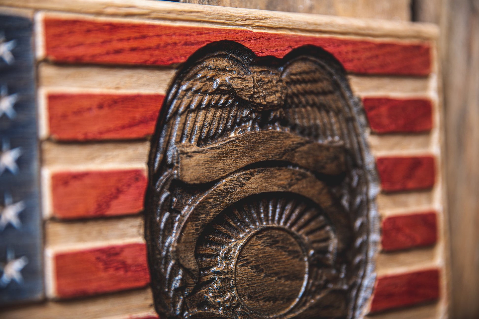You are viewing a gorgeous decorative solid hardwood police themed American Flag with a 3-D relief carved police badge. This custom designed flag is stained in traditional red, white & blue and features a true 3-D relief carving of a relatively universal police badge. Each badge takes several hours to carve and produces 3-dimensional wood carving of the absolute highest quality at a price equal or below other flags you will find. Your flag can be personalized with the text of your choice right on to the badge to commemorate your loved one's public service. This wooden flag is a perfect gift for the new officer, retiree or any special occasion when a unique gift is needed. Each flag is finished in multiple coats of high gloss polyacrylic. For wall mounting route out a keyhole slot on the rear of the flag. We currently offer this flag in 3 different sizes: 16"x8" 24"x12" and 32"x16". Please be sure to select desired size at checkout.