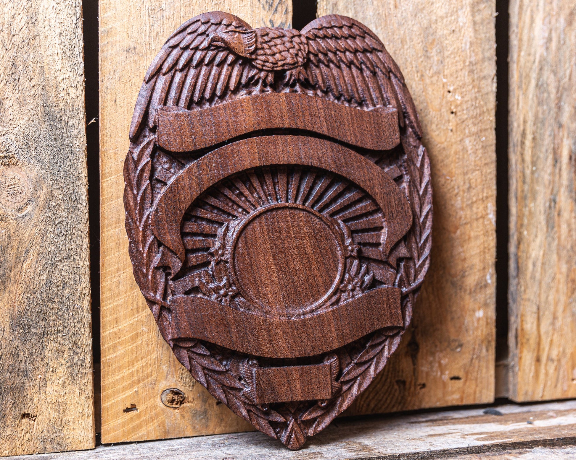 You are viewing a gorgeous solid walnut customizable police badge plaque. This plaque is the perfect gift for promotions, retirements or any occasion. Each banner can be personalized with your officer's city, name and badge number. This particular plaque is a true 3D relief carving and takes many hours to make. The circle in the center comes engraved with "Protect & Serve" by default but that can be customized as well. Your plaque comes finished in a hand rubbed oil finish and a coat of bee's wax. To display the plaque, we fit it with a claw tooth hanger. Plaque measures 12"x9"x.75" This design is a general style police officer badge that is widely used across the United States. If you have a particular badge design that you have in mind please contact us to see if we can accommodate you!