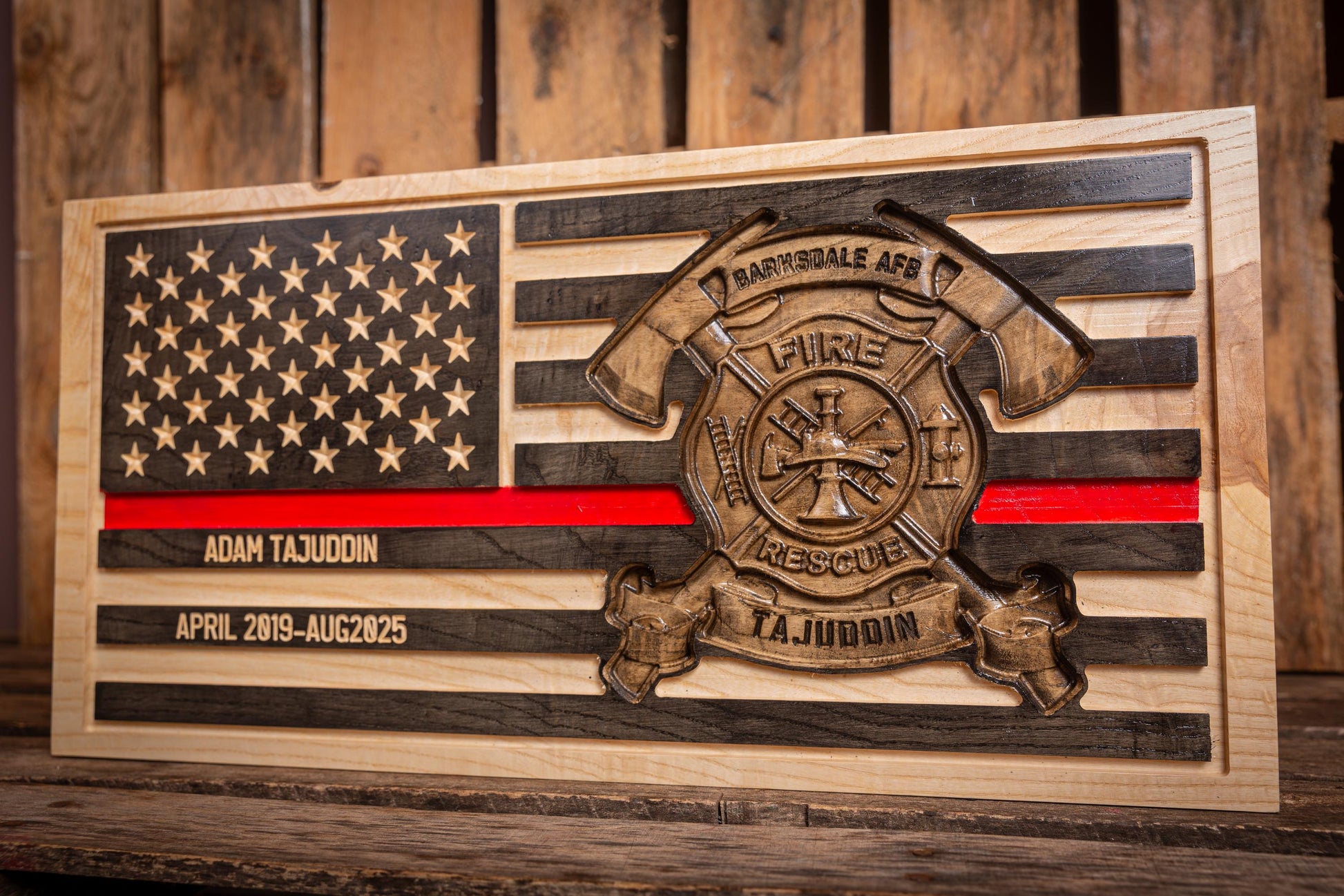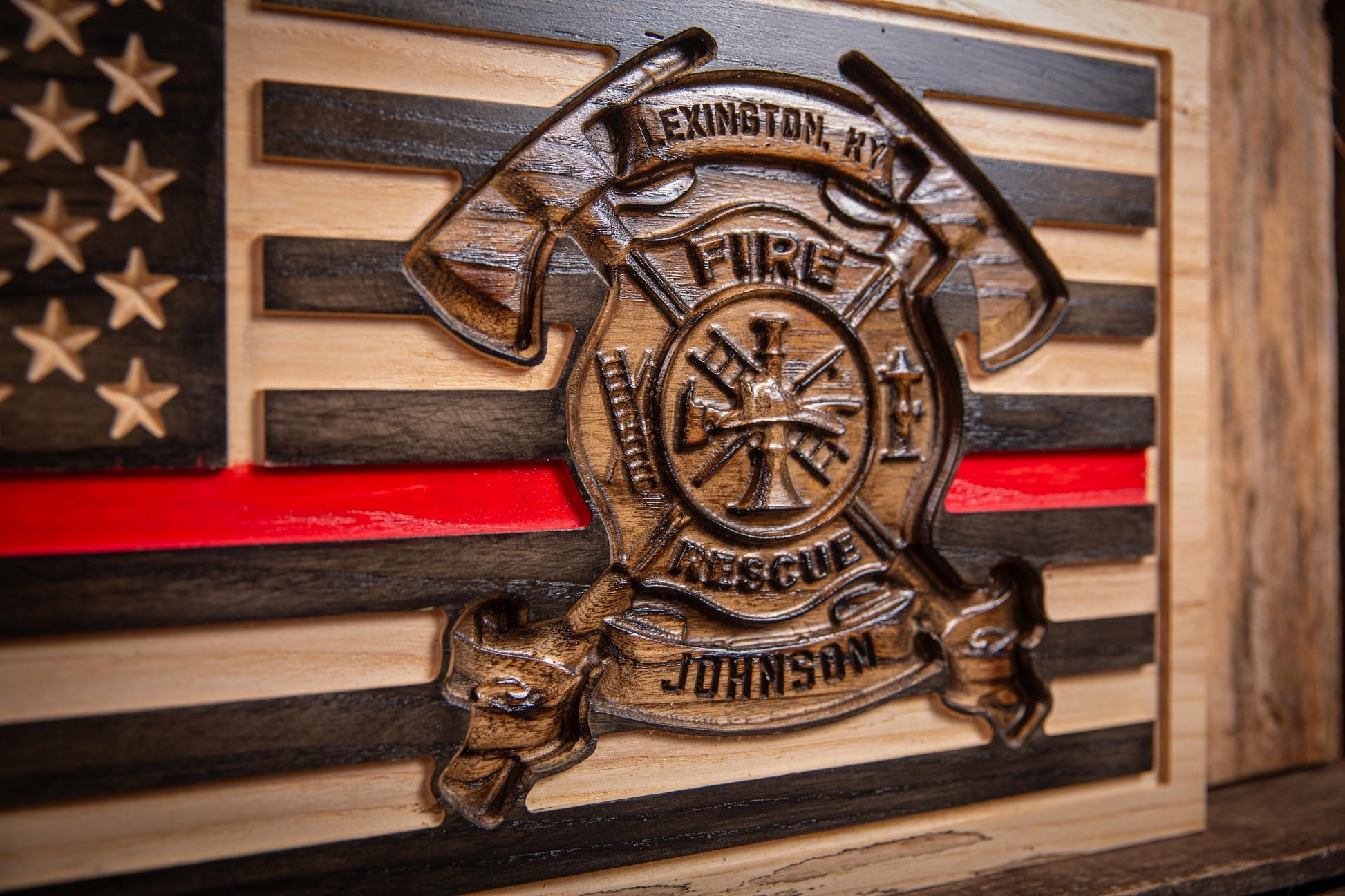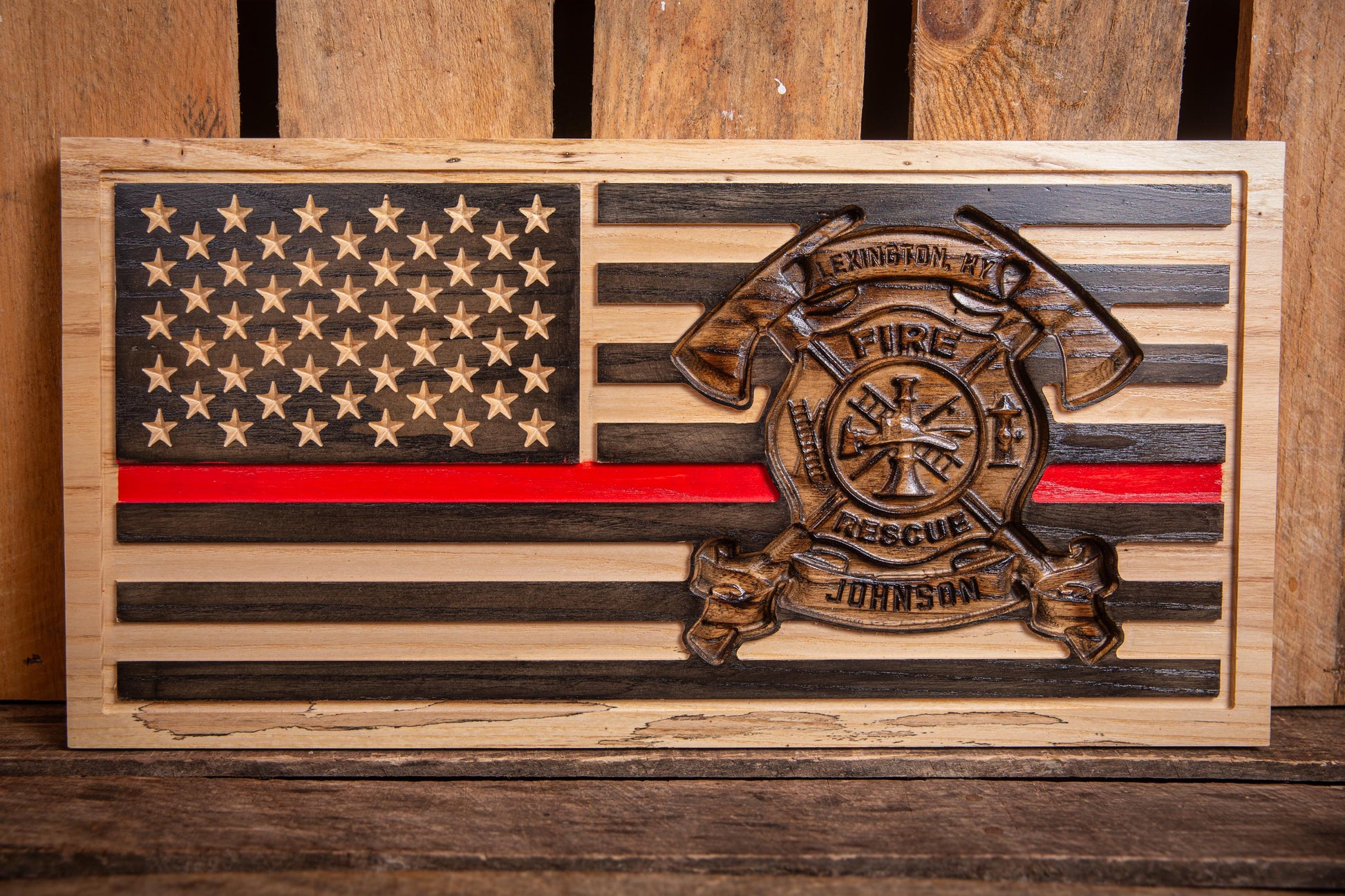 The perfect graduation or retirement gift! This gorgeous solid hardwood fireman themed personalized Thin Red Line Flag with a 3-D relief carved Maltese cross fireman's seal. Please look closely at the seal carvings of our flags. They are a true 3-D relief carving unlike many flags you will find on Esty. Almost all other flags you will find on the internet use a carving process called "V-Carving" on the seal which is quick to produce but only yields a 2-D effect. Each seal takes several hours to carve and produces a true 3-dimensional wood carving of the absolute highest quality at a price equal or below other flags you will find. Your flag can be personalized with the text of your choice right on to the Maltese cross to commemorate your loved one's public service. This wooden flag is a perfect gift for the new firefighter or retiree, or any special occasion when a unique gift is needed. Each flag is stained in the Thin Red Line theme and then finished in several coats of high gloss polyacrylic. For wall mounting, we route a keyhole slot on the rear of the flag. We currently offer this flag in 3 different sizes: 16"x8" 24"x12" and 32"x16". Please be sure to select desired size at checkout.
