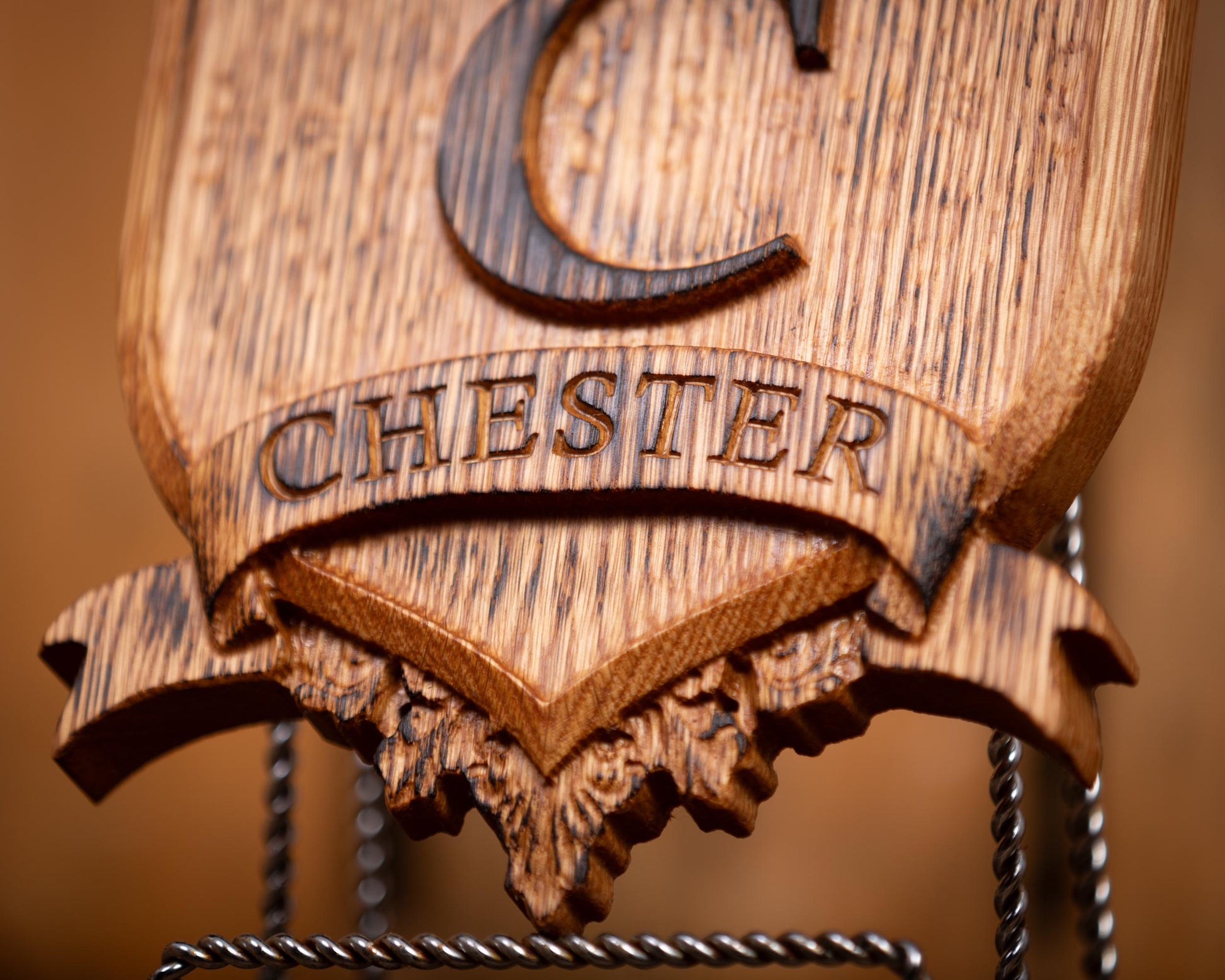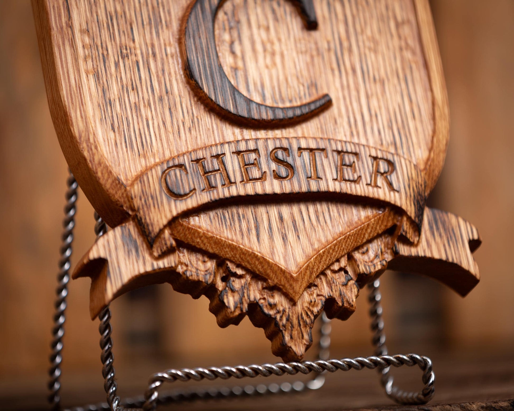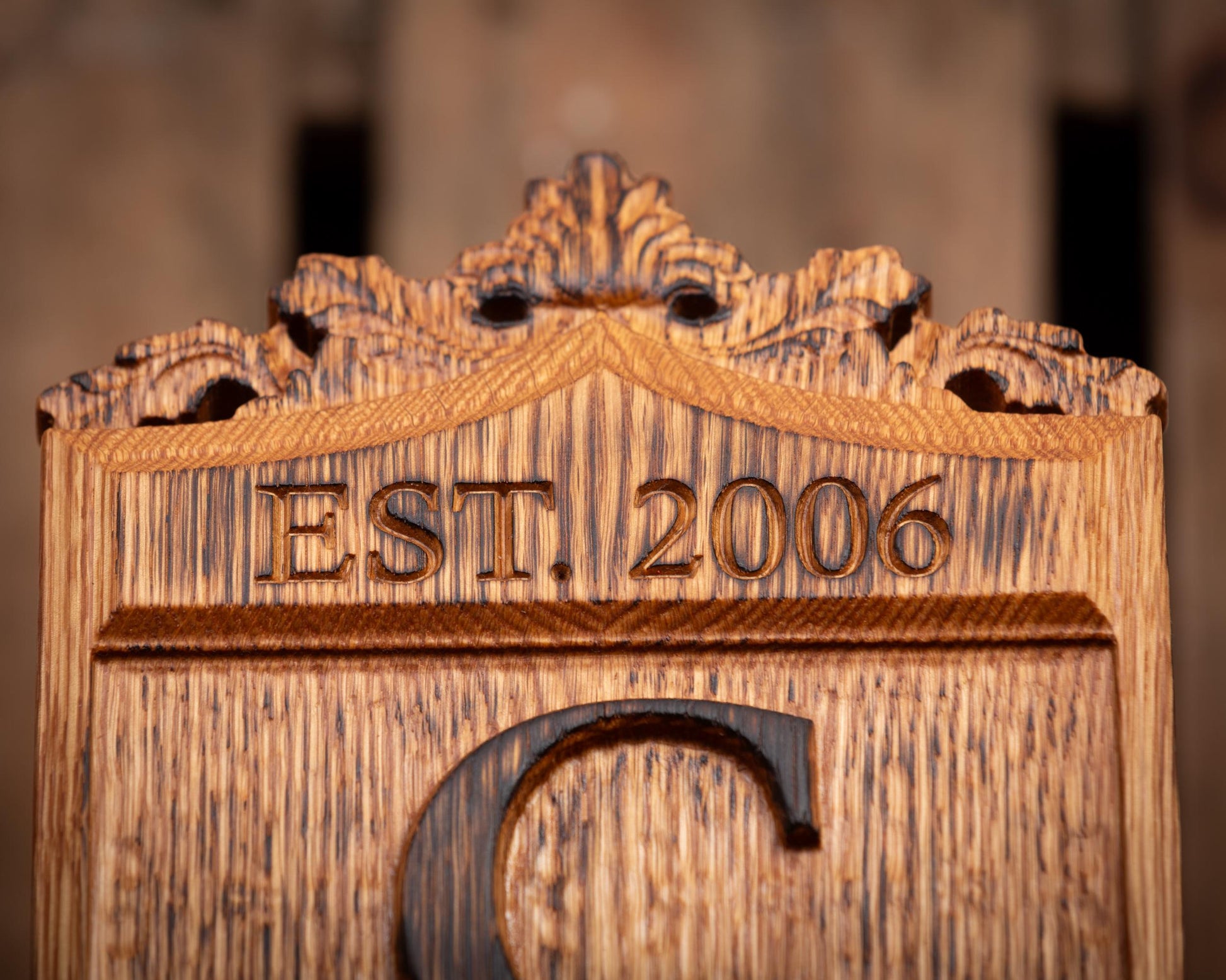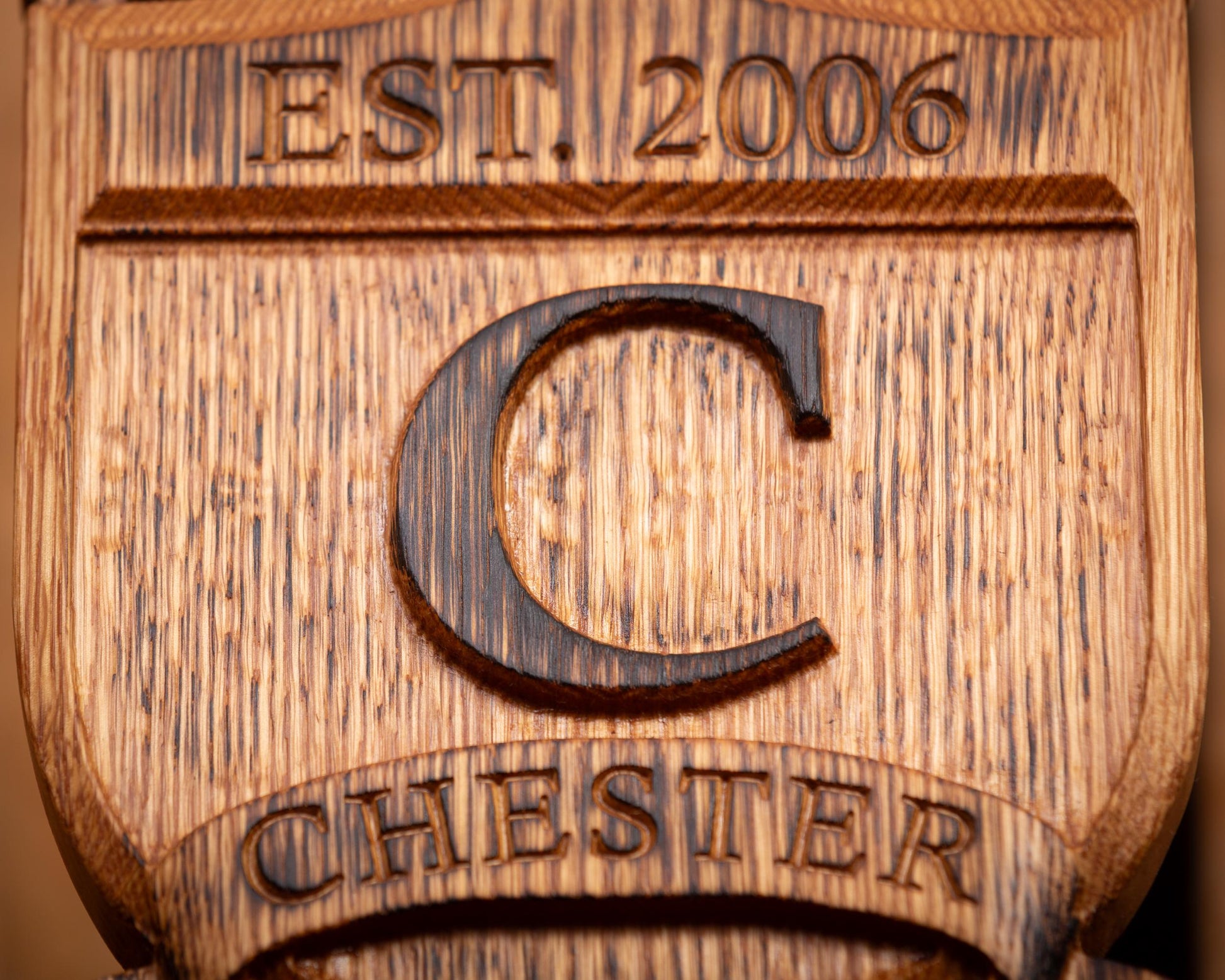Beautifully carved personalized wood crest sign with established date, monogram and family name. Carved from a solid piece of white oak and lightly torched to add an aged and rustic look, this unique piece of wall art makes the perfect gift for weddings, anniversaries or any special occasion. Each sign is sealed in all-natural beeswax and fitted with a claw tooth hanger for easy mounting.