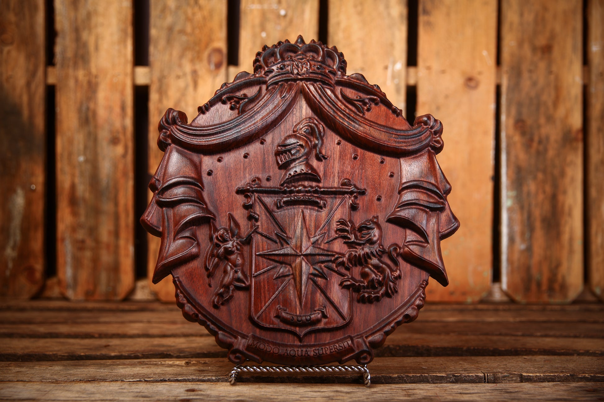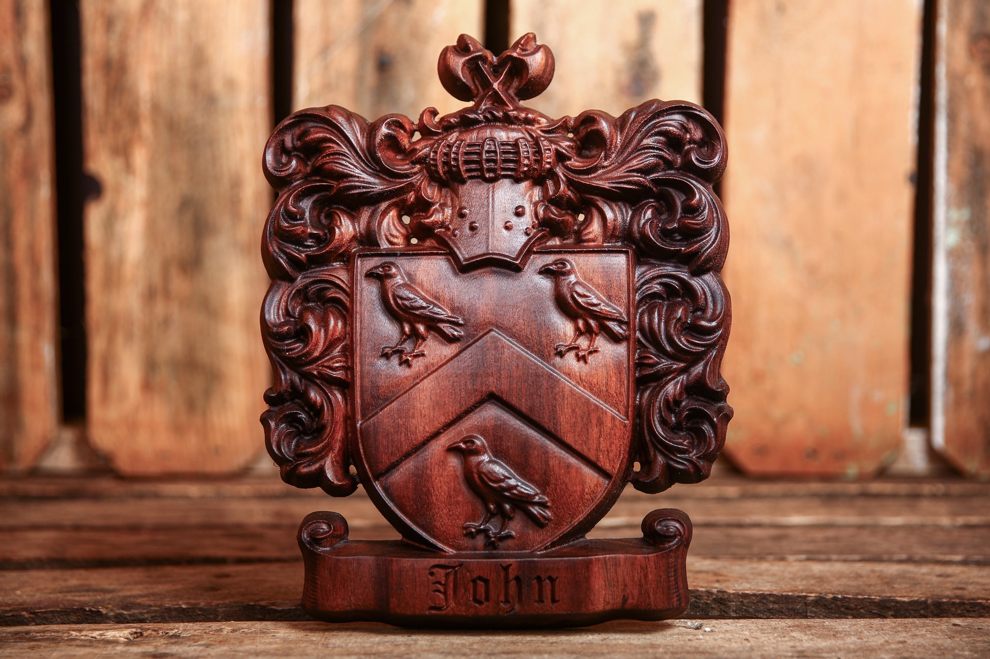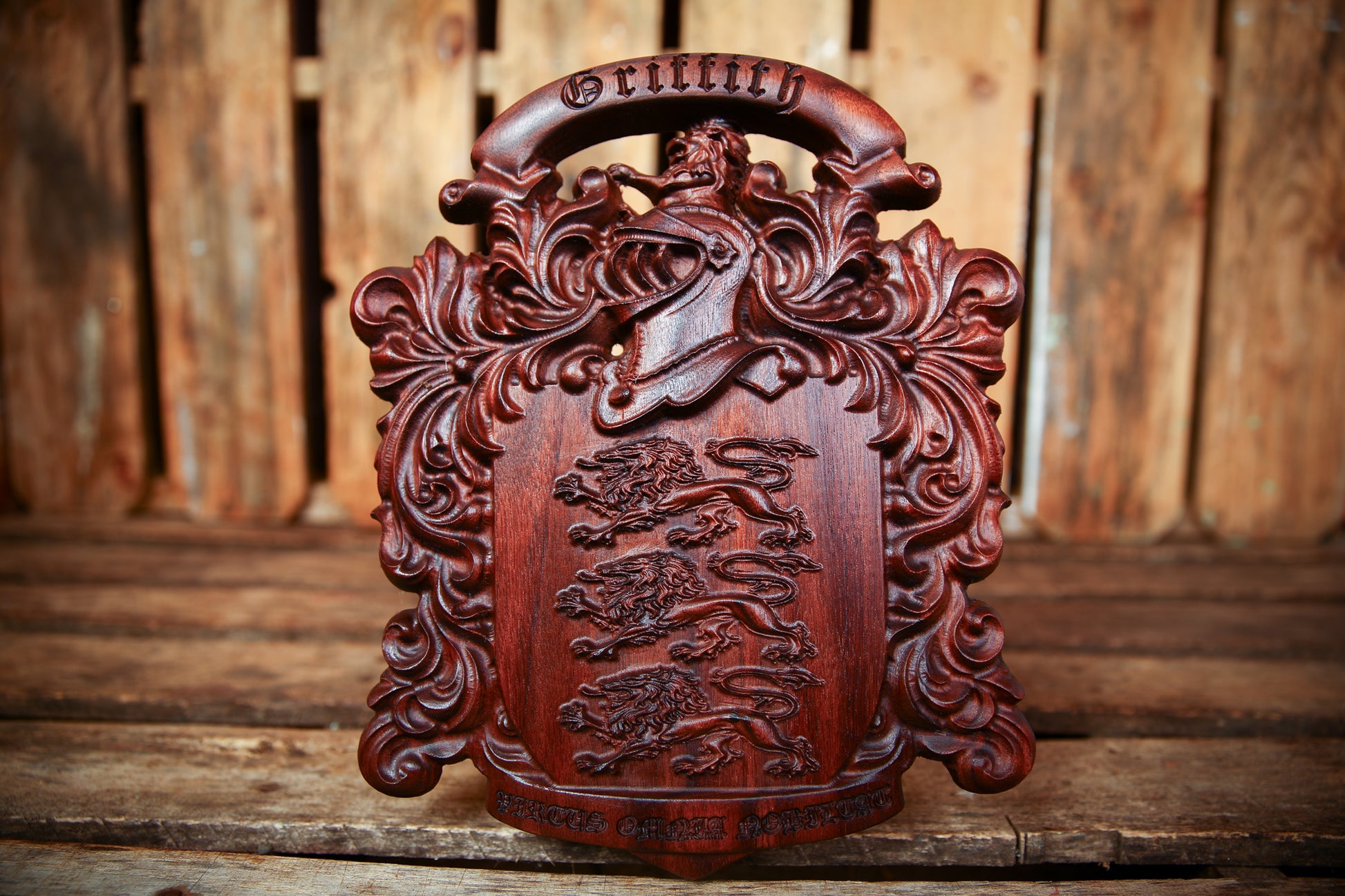 Bring your lineage to life with a one-of-a-kind Coat of Arms plaque carved from solid hardwood.