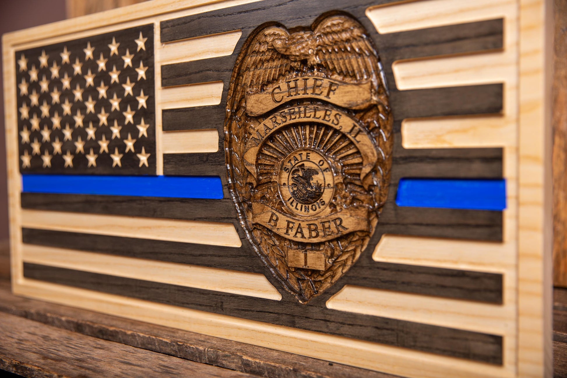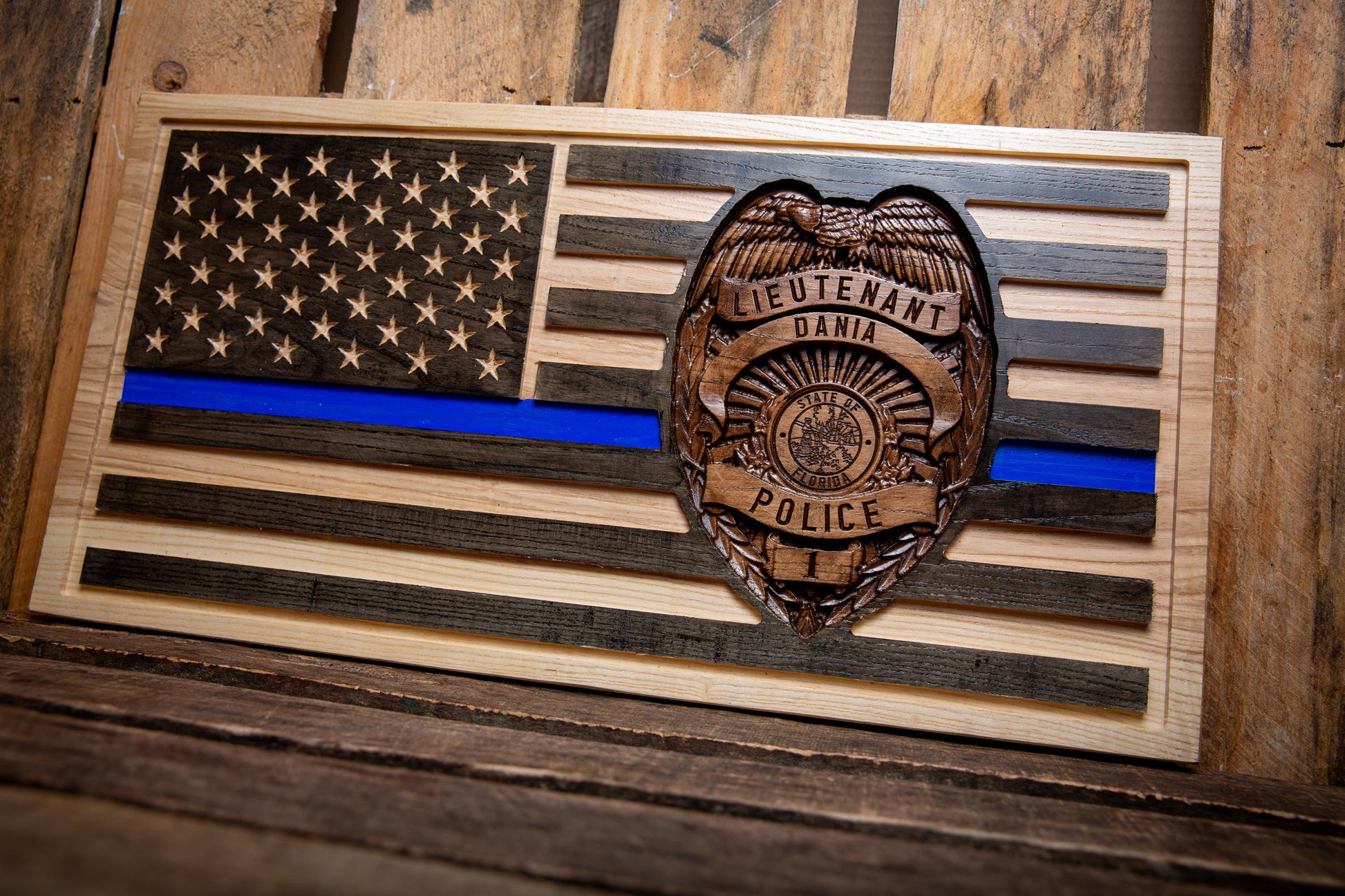 Looking for a unique graduation or police retirement gift? This custom Thin Blue Line flag with personalized 3D badge fits the bill perfectly. This particular design uses a true 3-D relief carving of a relatively universal police badge. Each badge takes several hours to carve and produces a true 3-dimensional wood carving of the absolute highest quality at a price equal or below other flags you will find. Your flag can be personalized with the text of your choice right on to the badge to commemorate your loved one's public service. This wooden flag is a perfect gift for the new officer, retiree or any special occasion when a unique gift is needed. Each flag is finished in several coats of high gloss polyacrylic. For wall mounting we route a keyhole slot in the rear of the flag. We currently offer this flag in 3 different sizes: 16"x8" 24"x12" and 32"x16". Please be sure to select desired size at checkout.